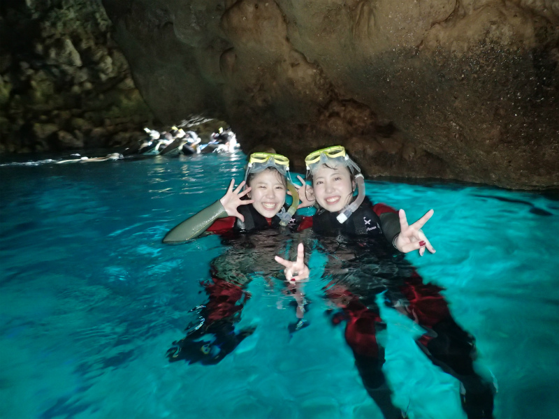 青の洞窟の中のまぶしいほどのクリスタルブルーと外洋に広がるディープブルーの大珊瑚礁。この体験、感動間違いなし!!