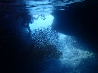青の洞窟の中のまぶしいほどのクリスタルブルーと外洋に広がるディープブルーの大珊瑚礁。この体験、感動間違いなし!!