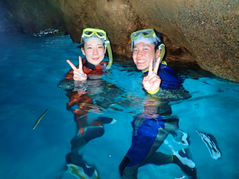 青の洞窟の中のまぶしいほどのクリスタルブルーと外洋に広がるディープブルーの大珊瑚礁。この体験、感動間違いなし!!