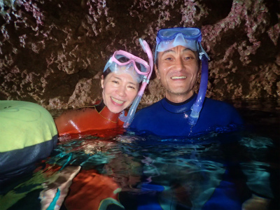 青の洞窟の中のまぶしいほどのクリスタルブルーと外洋に広がるディープブルーの大珊瑚礁。この体験、感動間違いなし!!