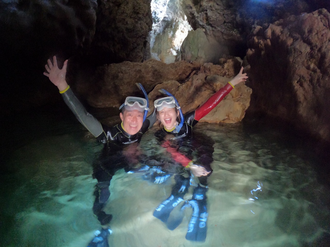 青の洞窟の中のまぶしいほどのクリスタルブルーと外洋に広がるディープブルーの大珊瑚礁。この体験、感動間違いなし!!