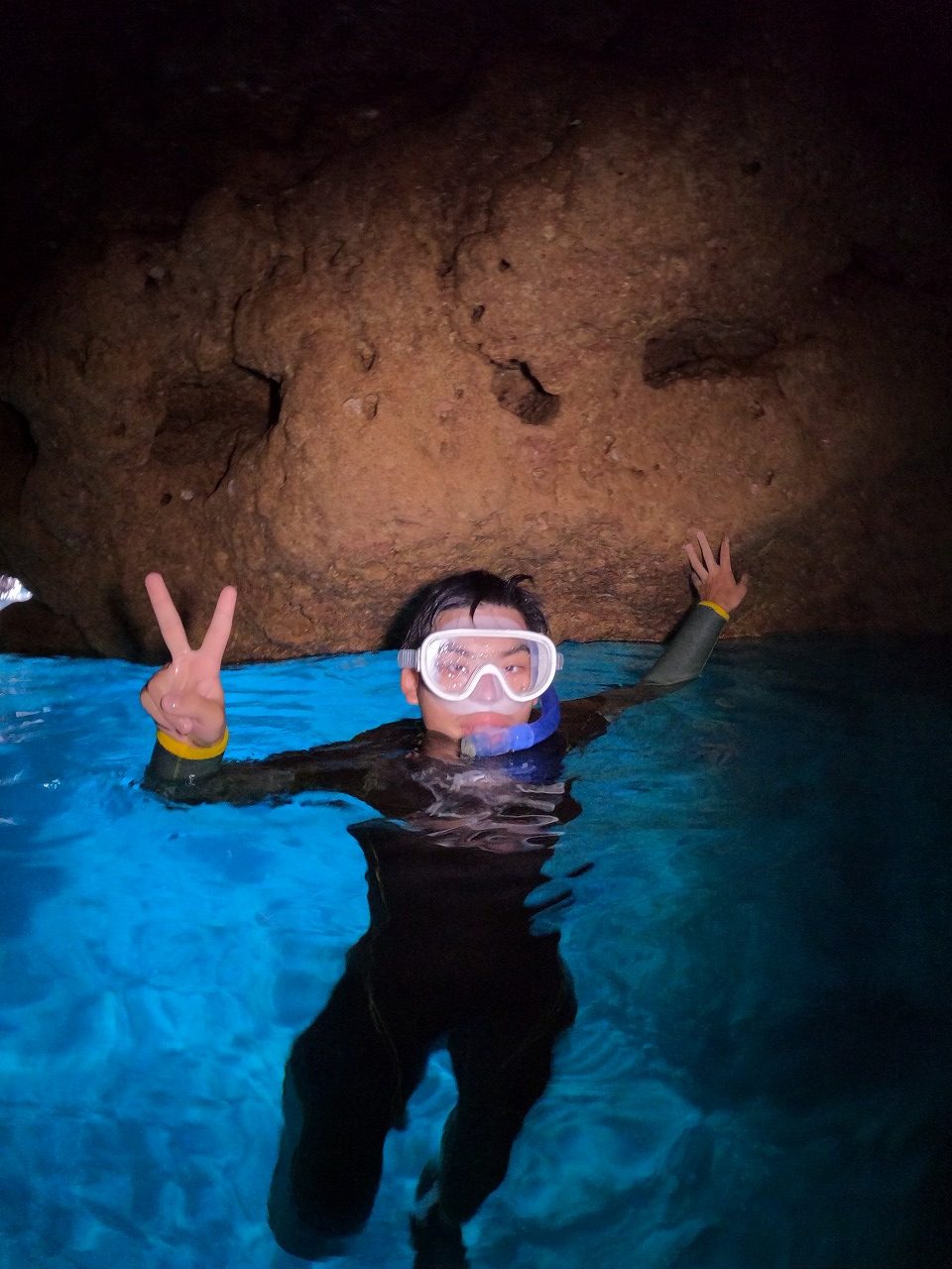 青の洞窟の中のまぶしいほどのクリスタルブルーと外洋に広がるディープブルーの大珊瑚礁。この体験、感動間違いなし!!