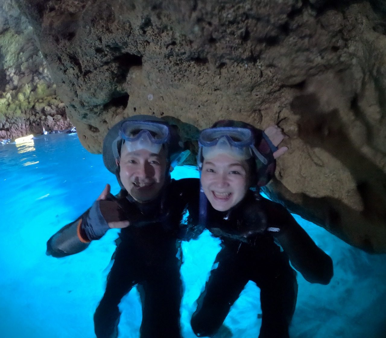 青の洞窟の中のまぶしいほどのクリスタルブルーと外洋に広がるディープブルーの大珊瑚礁。この体験、感動間違いなし!!