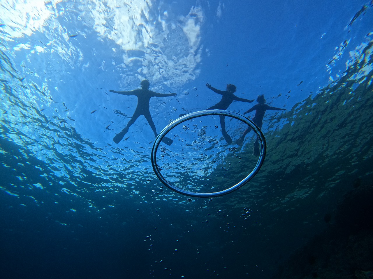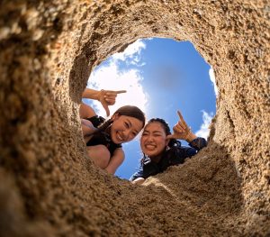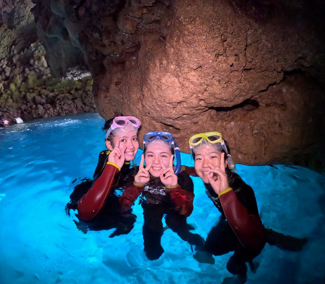 青の洞窟の中のまぶしいほどのクリスタルブルーと外洋に広がるディープブルーの大珊瑚礁。この体験、感動間違いなし!!